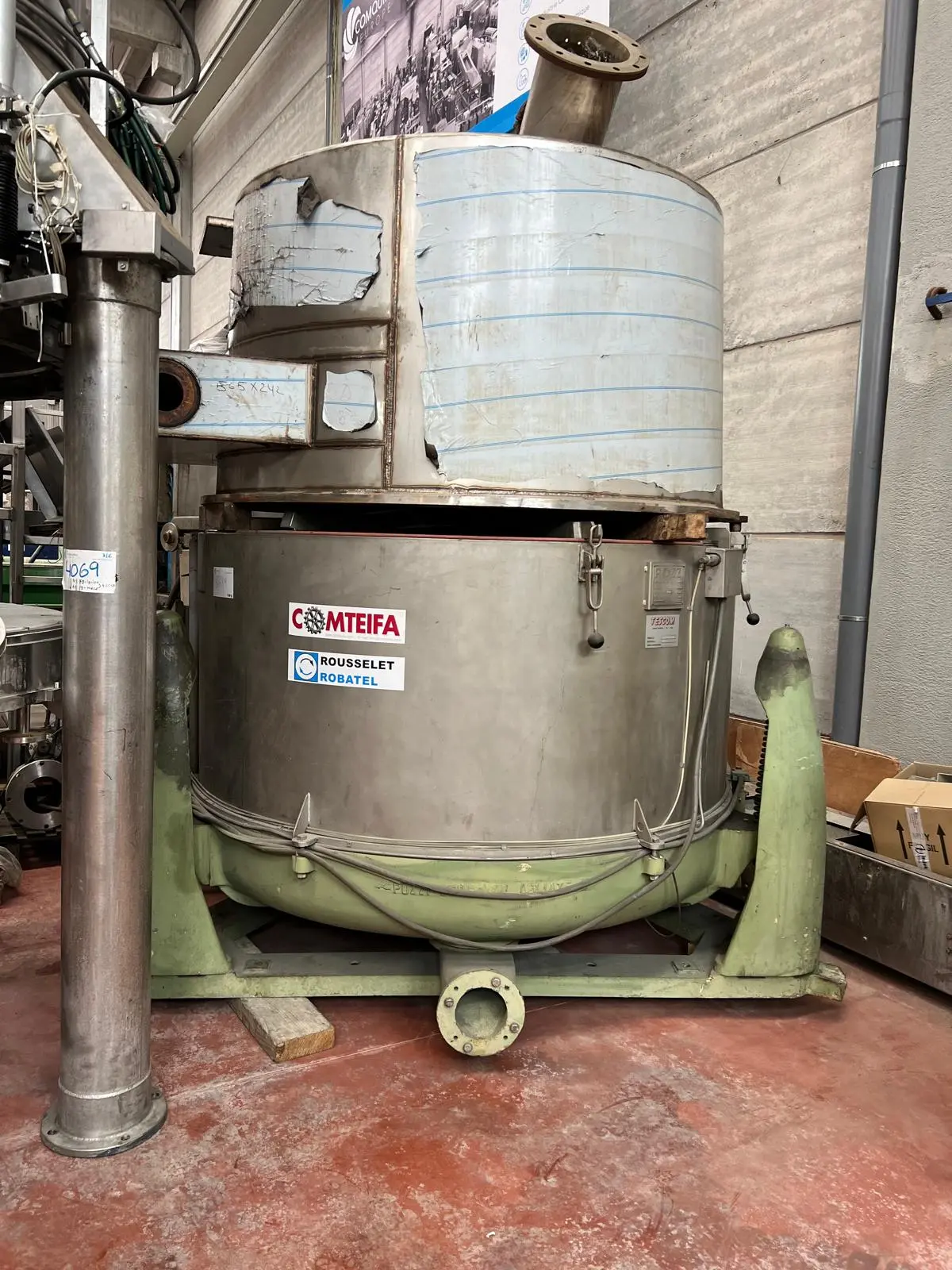Centrifugeuse à panier à axe vertical à décharge supérieure avec sac monté sur plaque d'inertie reconditionnée. Modèle 100F-500 fabriqué par RIERA NADEU Toutes les pièces en contact avec le produit sont en acier inoxydable AISI 316L Suspension : Centrifugeuse de type rigide sur plateau d'inertie avec quatre supports anti-vibrations. Couvercle : avec 5 fermetures à ouverture manuelle, ouverture du couvercle au moyen d'un piston hydraulique (y compris centrale hydraulique), deux voyants plats, raccords pour entrée N2 et avec raccords pour tube de lavage et tube de chargement Transmission : Moteur électrique ATEX 4 kW Sécurité : Pneumatique Ouverture du couvercle à piston de sécurité, détecteur de piston de sécurité du couvercle. détecteur de couvercle ouvert. détecteur pour tachymètre dans la machine et le moteur (comprend boîte de connexion) sondes de température dans la colonne de roulement et système de continuité de masse DCM